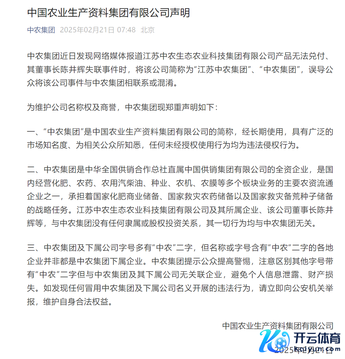 中农集团声明:与“江苏中农集团”过甚董事长失联事件无关联kai云体育app官网版下载官网中农集团声明:与“江苏中农集团”过甚董事长失联事件无关联